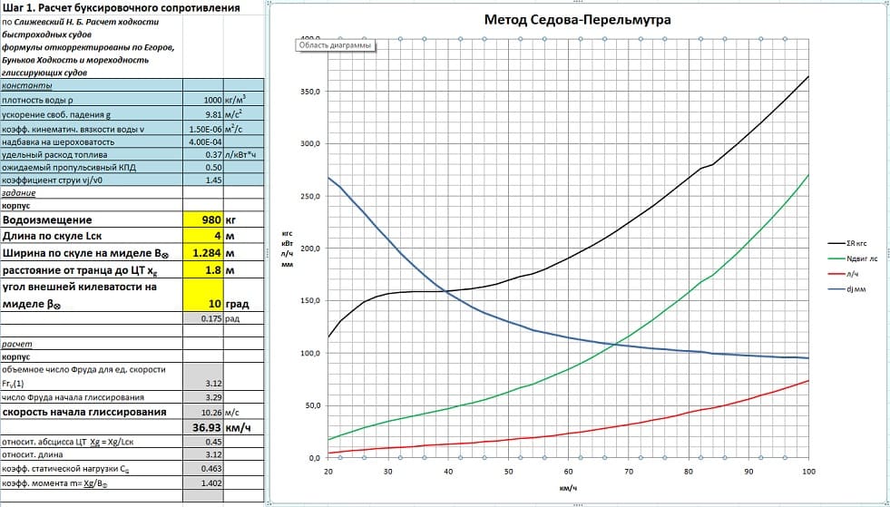 При некоторых отклонениях в исходных данных картина сильно поменяется. В том числе начальная скорость глиссирования. Конечно, глиссировать этот корпус начинает на спонсонах, т.е. всей шириной днища. По факту начальная скорость глиссирования у этого корпуса в районе 27кмч. График так же изменится, горб станет меньше по высоте и короче в длину. По сути этот корпус 2в1, соотв график для думающего мозга будет очень интересным.