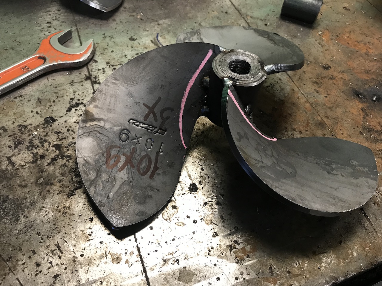 Правда при этом лопасть оказалась слабоватая у корня, две недели ушло, что бы правильно наварить лопасть и усилить её. Пробовал разные варианты усиления и нанесение несколько швов, и с накладкой заплатки... но потом приходилось по часу стачивать. После двадцати пробных винтов получил один непрерывный шов для увеличения толщины у корня лопасти до 8 мм.