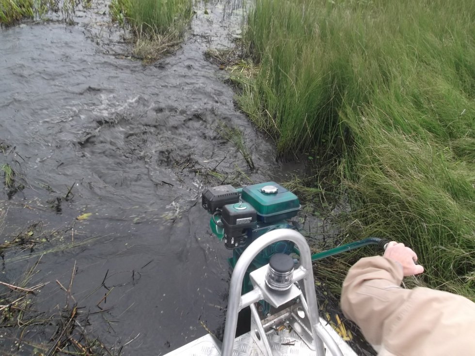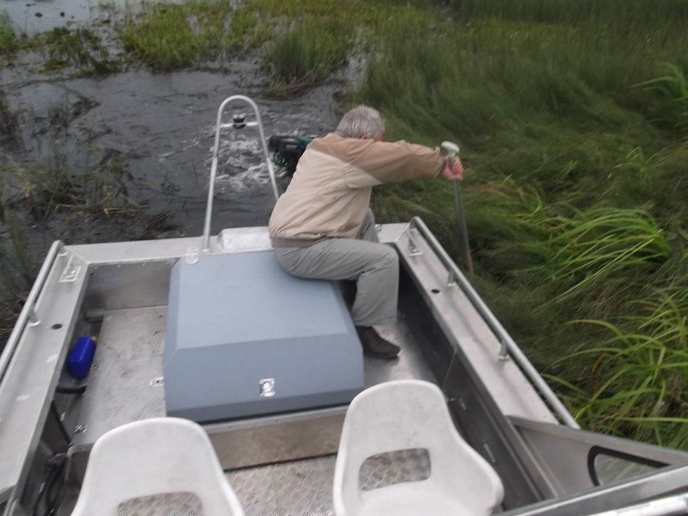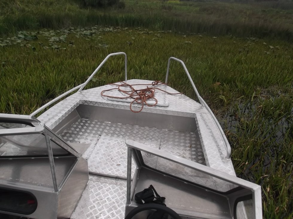 Зависит - от плотности травы и касания днищем дна, лучше бежит когда 1-2 чел переходят на нос - корма меньше тащит воду и осадка кормой уменьшается