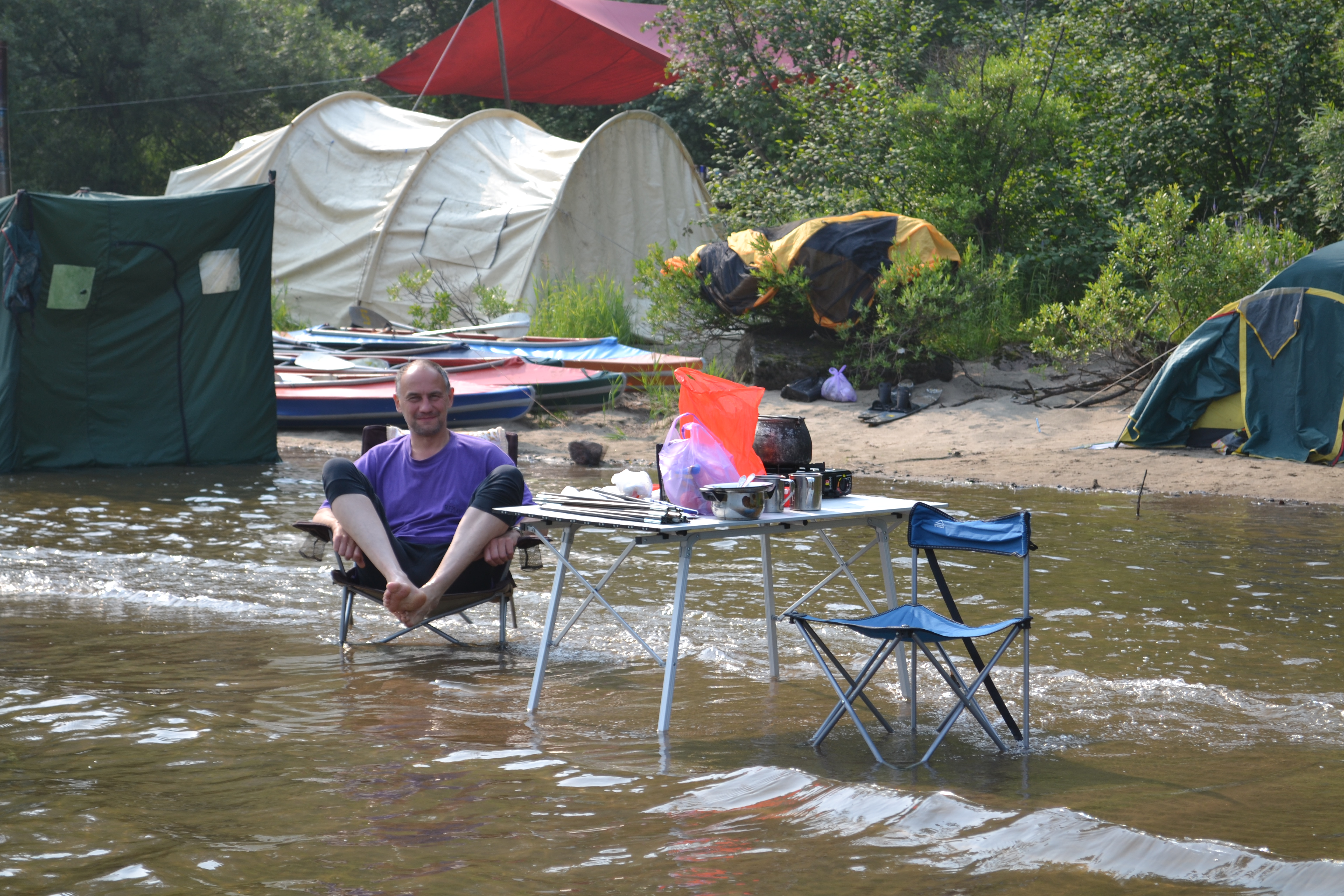 Вечером воды не было . А утром уже выплывали на матрасе из палатки.