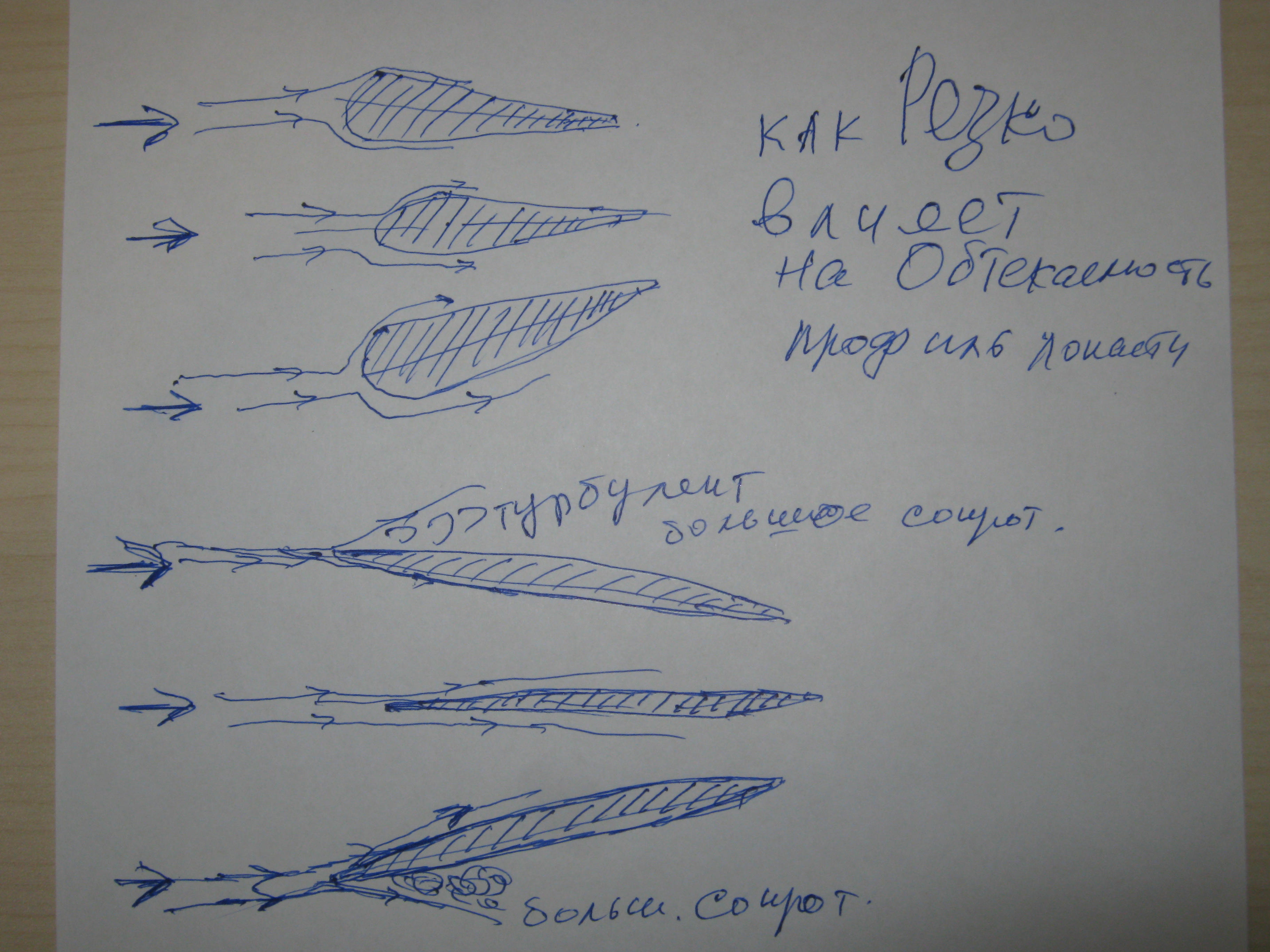 Но, если кромка заострена, или НЕКОРРЕКТНО , тяп-ляп "округлена", то , видно, что , при малейшем угле потока- почти с кромки, или сразу с кромки- образуются Вихри, и эти вихри , составляют значительную Потерю!