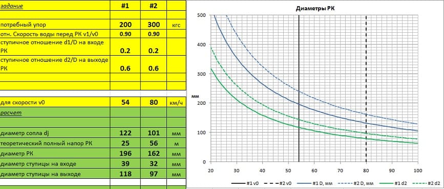 Дальше графики будут другие. Из прежних возьмем на заметку только цифры упора и скоростей. Графики будут содержать 2 варианта расчета. В исходных данных будем менять только 1 параметр и смотреть на что он влияет.