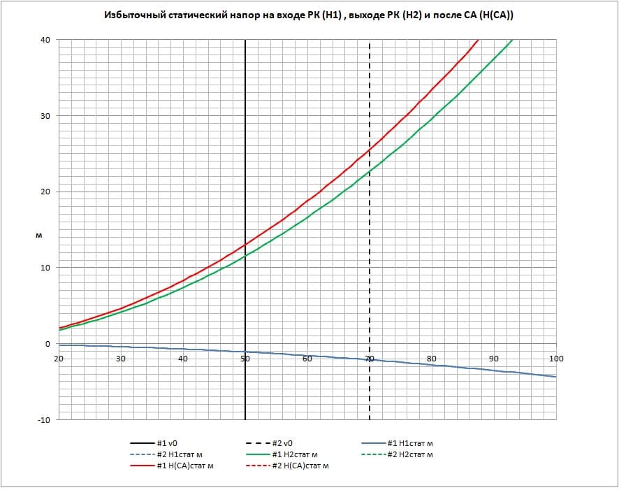 Зеленые линии – статика после РК. Чем она больше, тем больше объемные потери напора через зазор между РК и обечайкой. Но, с другой стороны, тем легче прокачать систему охлаждения. Какой здесь оптимум, хз. Предположим, что 15-20 метров будет хорошим компромиссом.