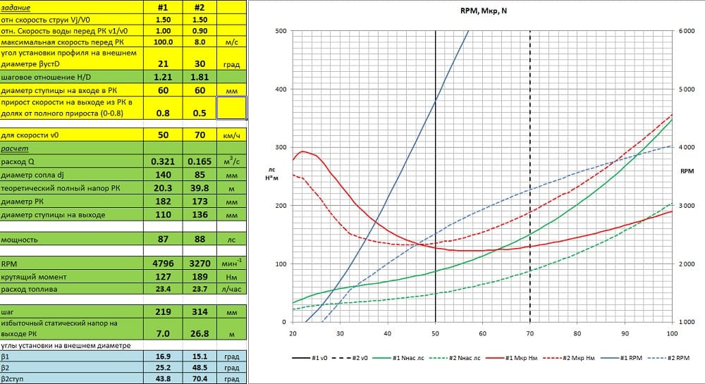 Скорость 50 км/ч это граница, до которой действовало правило скорость перед РК = 0.9 скорости лодки. Дальше скорость перед РК зафиксирована на уровне 12.5 м/с.