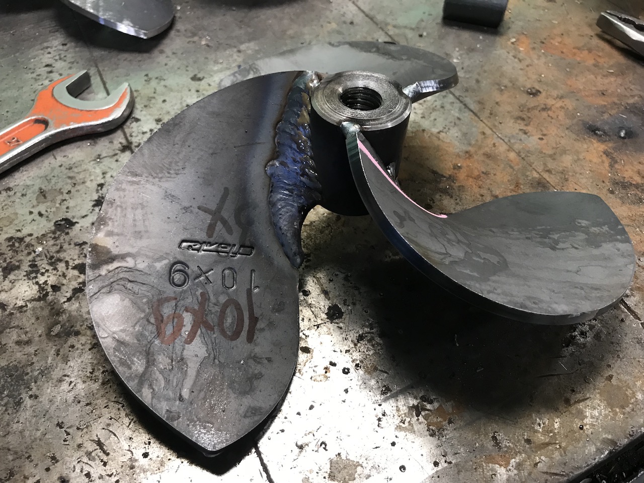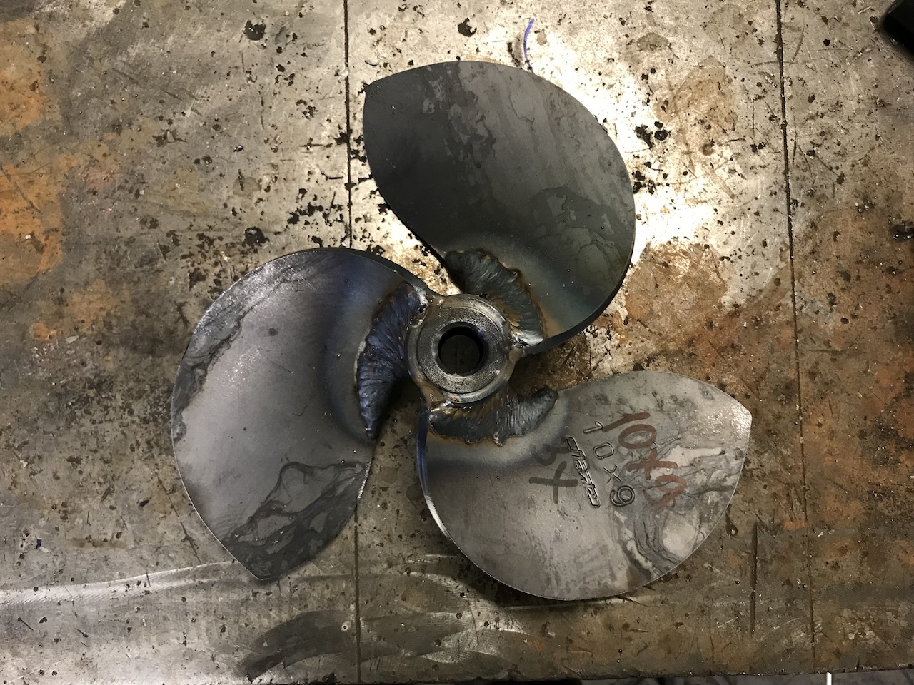 Правда при этом лопасть оказалась слабоватая у корня, две недели ушло, что бы правильно наварить лопасть и усилить её. Пробовал разные варианты усиления и нанесение несколько швов, и с накладкой заплатки... но потом приходилось по часу стачивать. После двадцати пробных винтов получил один непрерывный шов для увеличения толщины у корня лопасти до 8 мм.