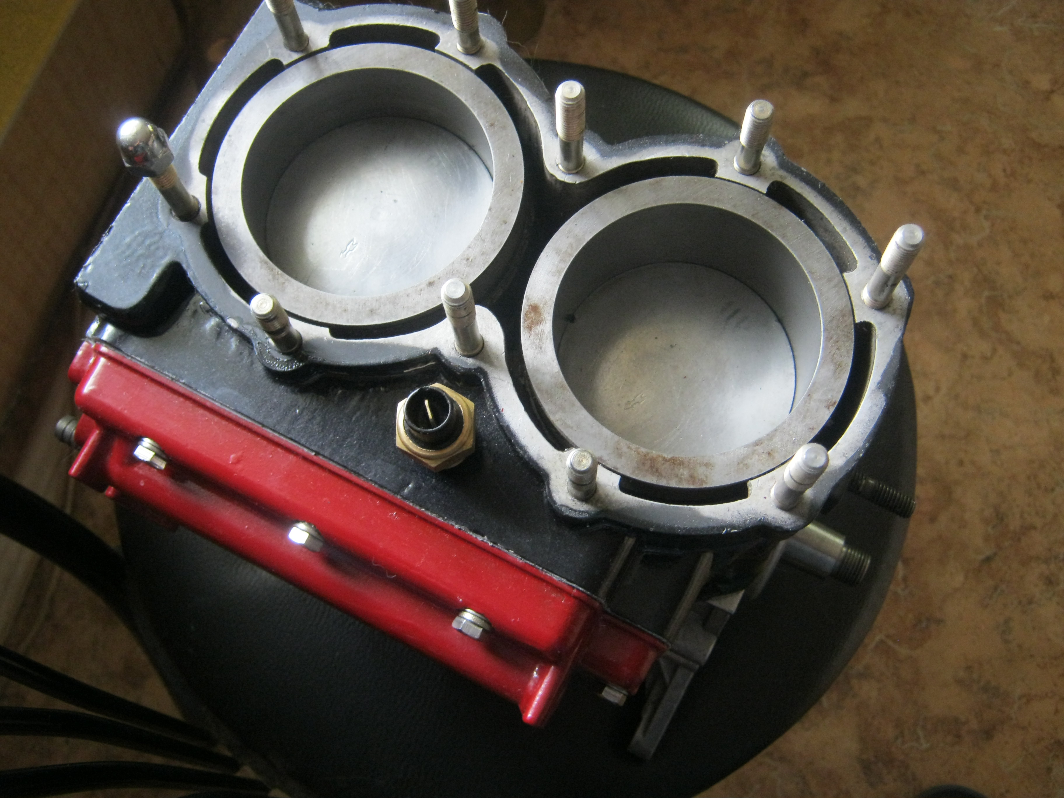 На верхнем фото вы видите скомпонованную , по всем правилам мокрых глушителей -систему штуцеров под шланги подвода выходной охлаждающей воды : с Основного контура; Со второго контура -в данном случае с контура подогрева дроссельной заслонки карбюратора. Плюс -перераспределение основного потока с тройника - на другие части внутренних обьёмов глушака- уголок(чтоб никто -не уволок