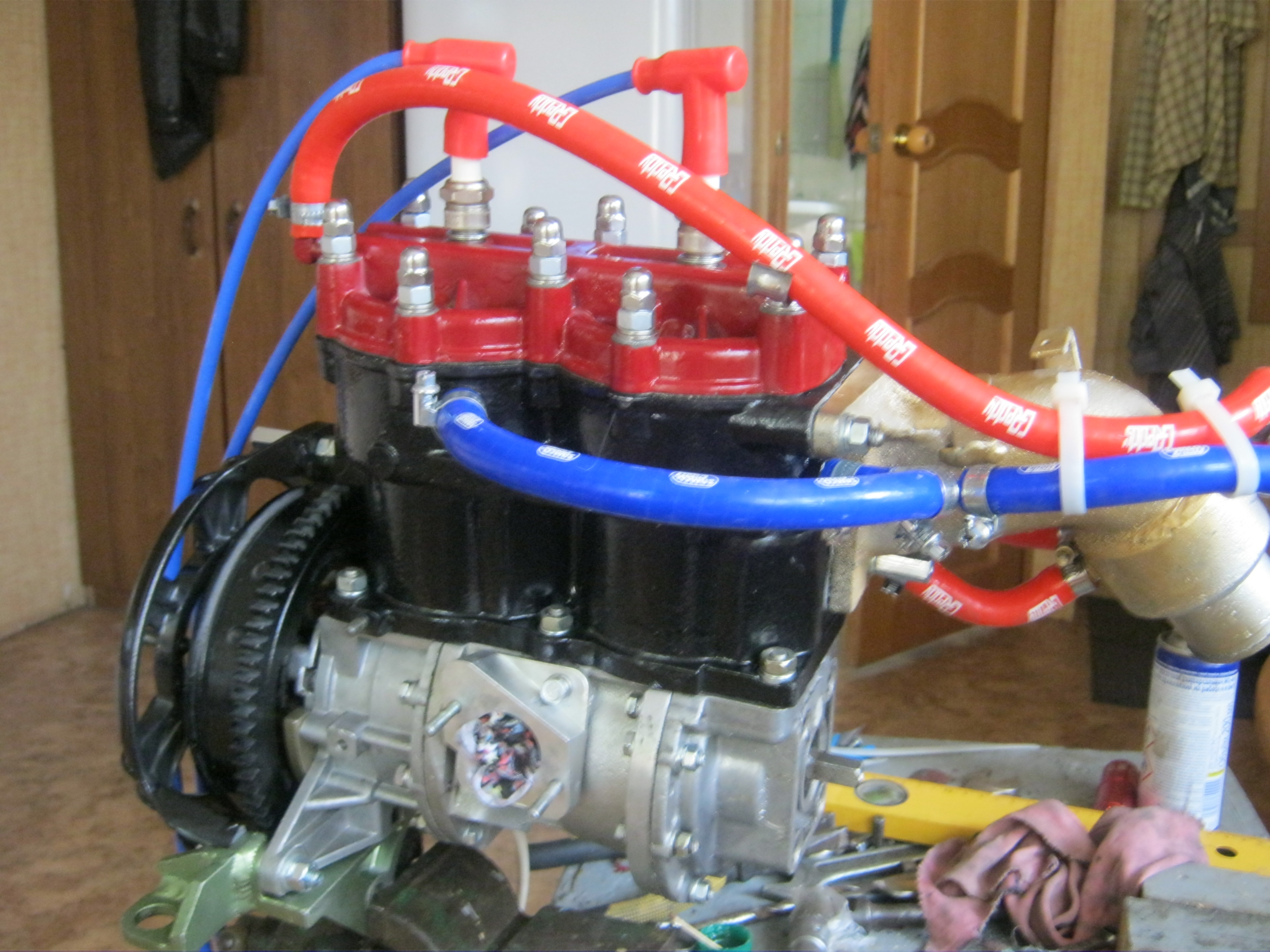 Выход(красный) : с головки(он и воздушник); со штатного глушителя (была контролька); собственно с мотора(со штатного отверстия) и всё ЭТО -завёл в в "золотой" выхлопной коллектор.