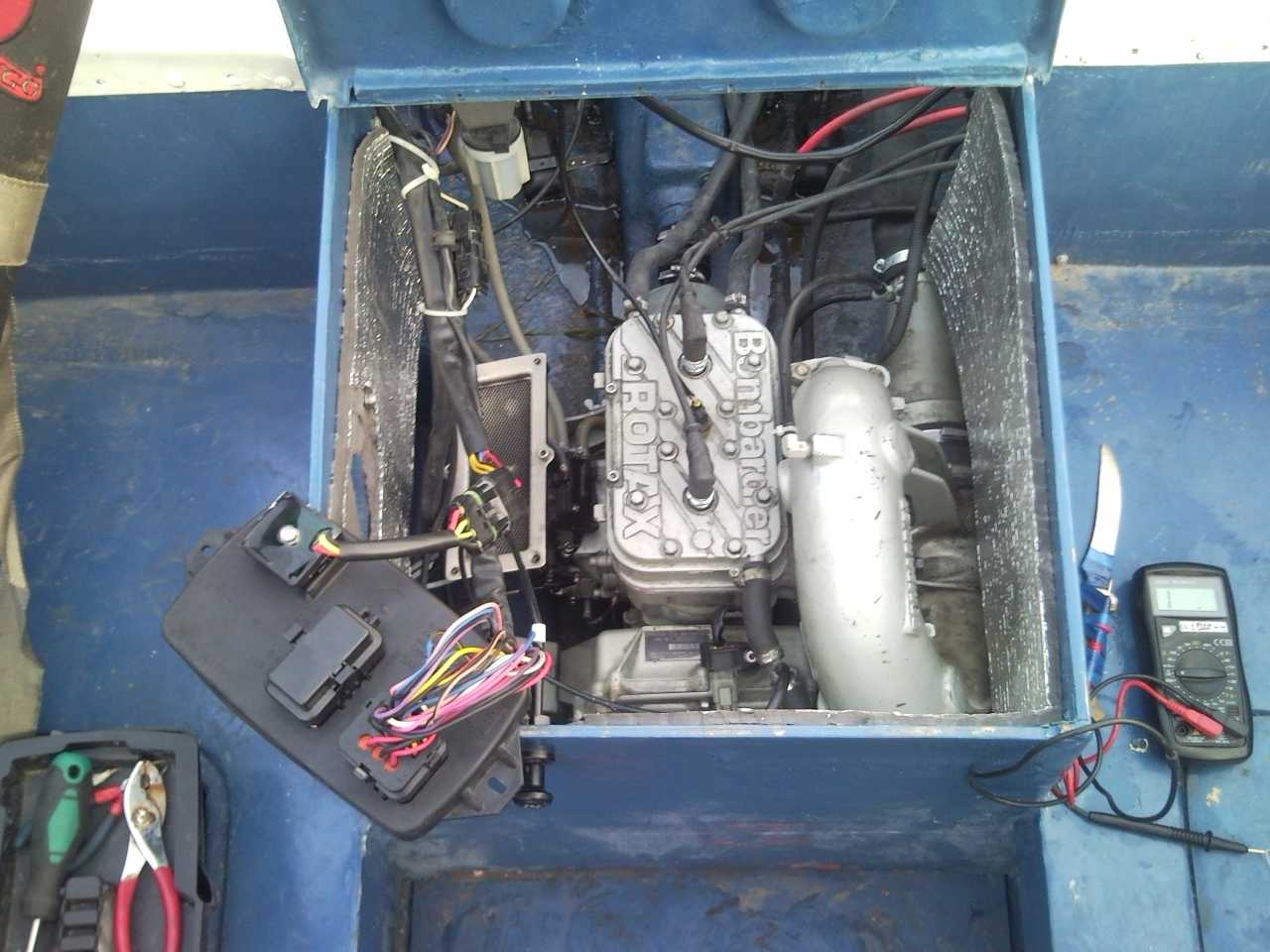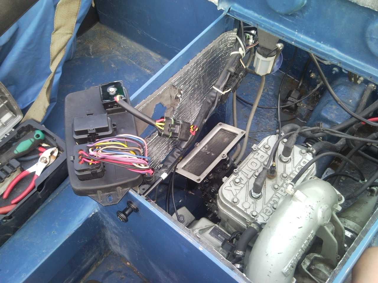 Очень шумно работает двигатель, это потому, что нет глушителя. При установки родного глушака от гидрика-донора звуковой сопровождение становится заметно тише, но все равно достаточно громко. И ещё двигателю трудно "выдыхать", выхлоп из глушителя пока сделан из дюритового шланга. И ввиду некоторых особенностей компановки, шланг перегибается и затруднен выхлоп, двигатель плохо набирает обороты. Убрал глушитель нафиг. Надо его устанавливать за транцем, тогда не будет ни каких перегибов и должно быть тише.