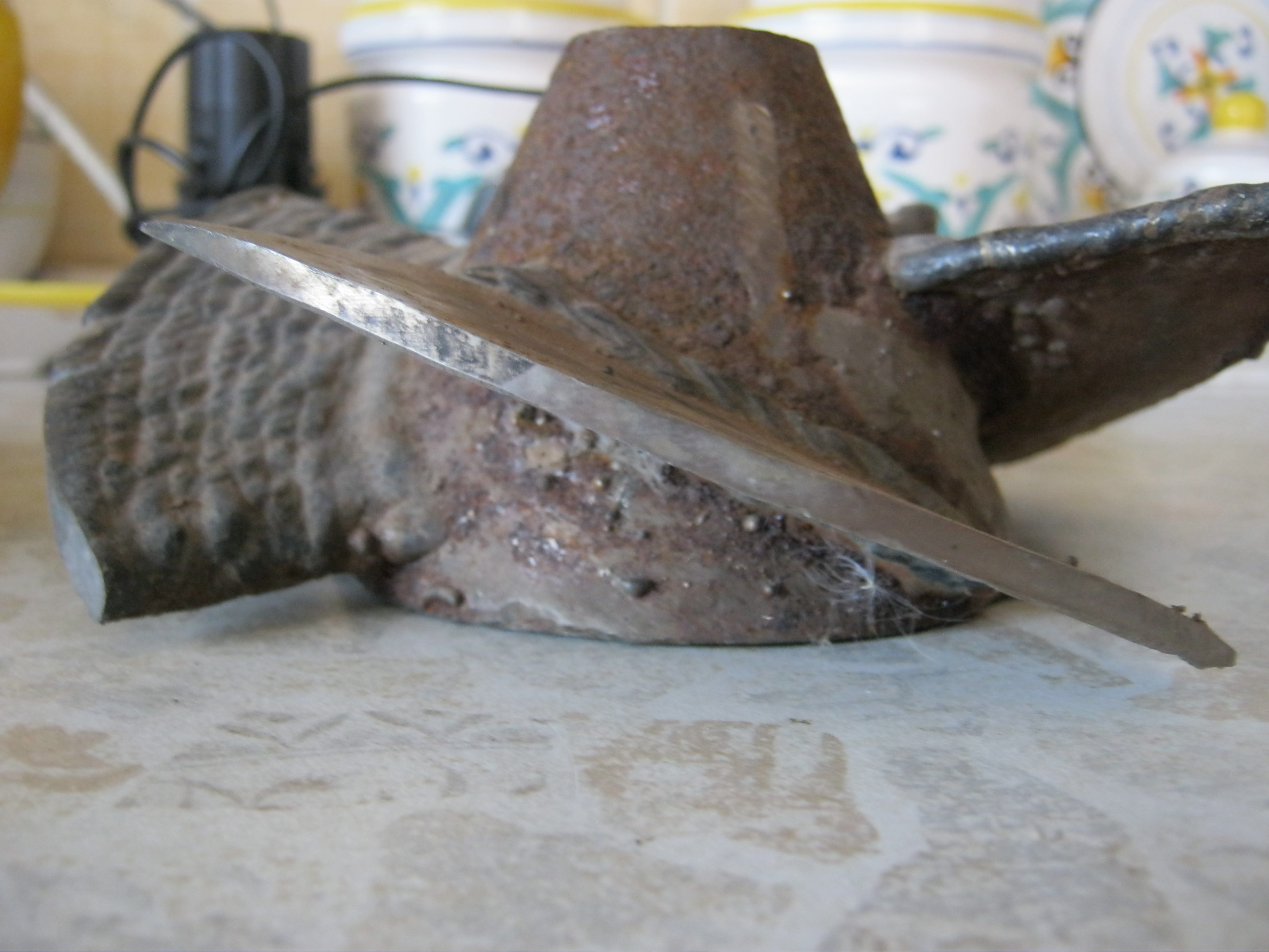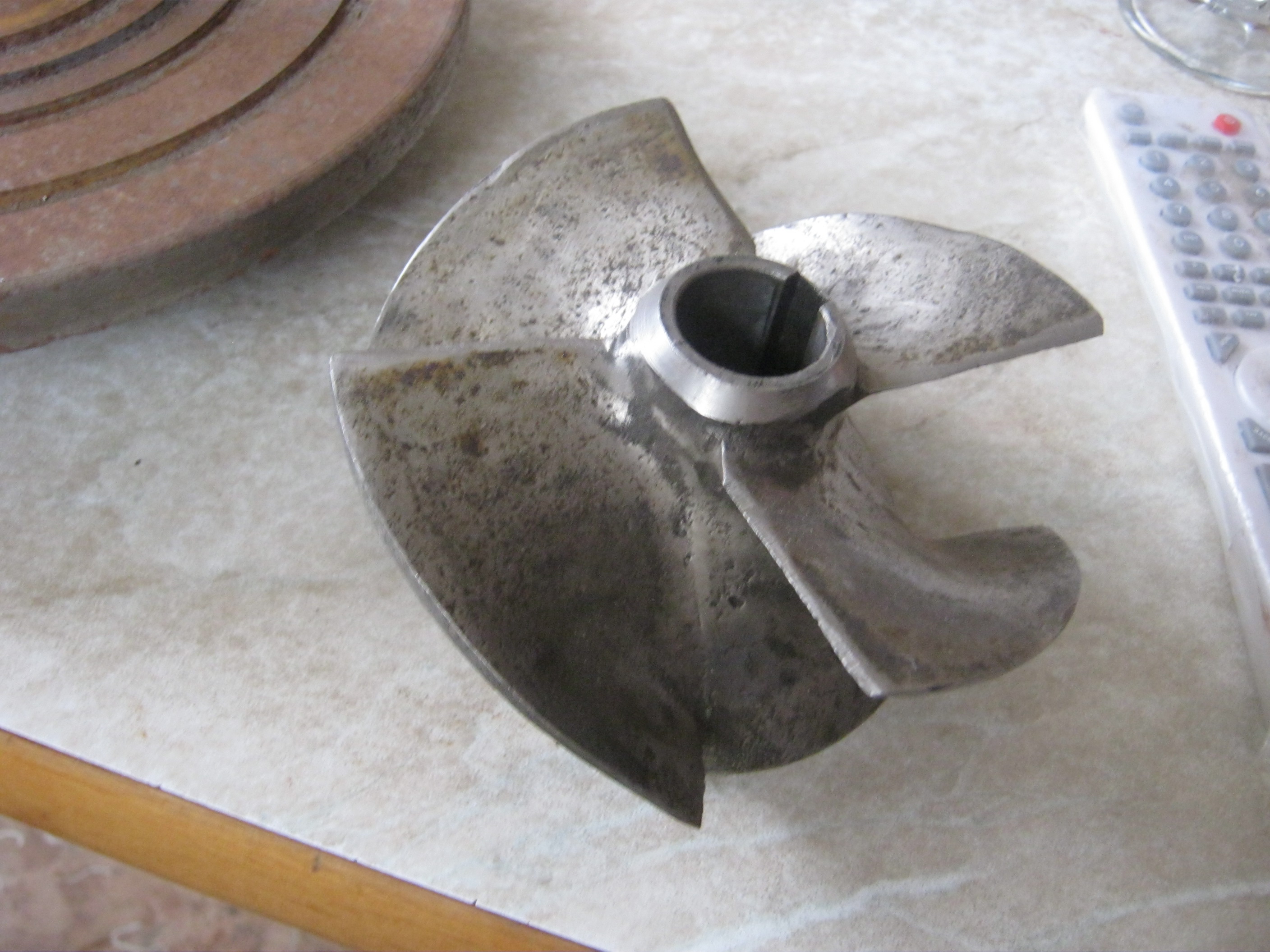 Лопасти погнуты, не очень, водомёт работал с решёткой. Но, винтовая линия , кое-где нарушена, видимо вручную - выковыривали что-то.