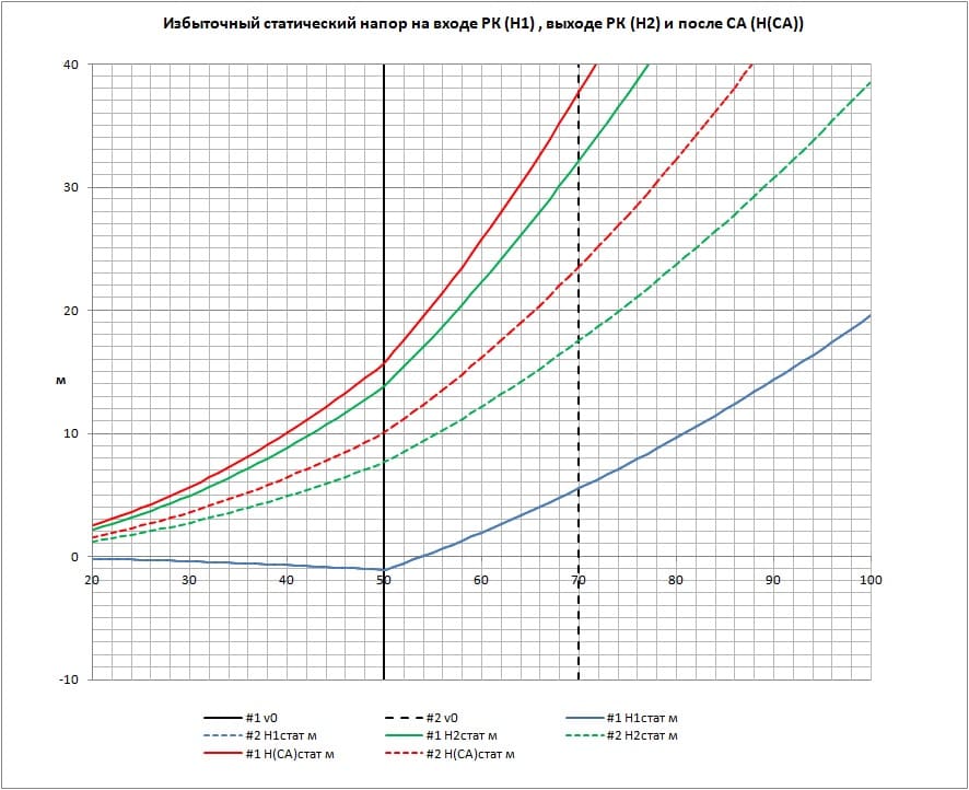 Зеленые линии – статика после РК. Чем она больше, тем больше объемные потери напора через зазор между РК и обечайкой. Но, с другой стороны, тем легче прокачать систему охлаждения. Какой здесь оптимум, хз. Предположим, что 15-20 метров будет хорошим компромиссом.