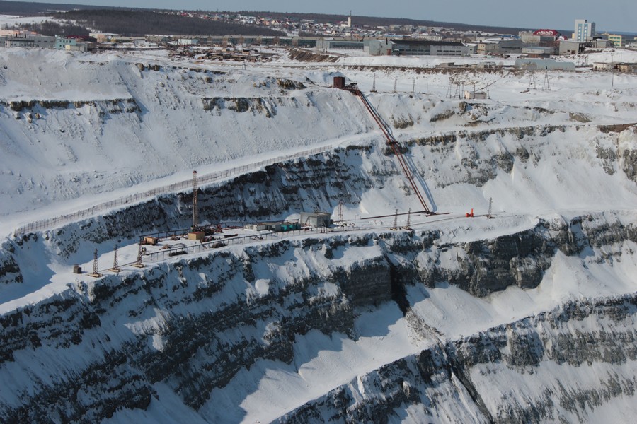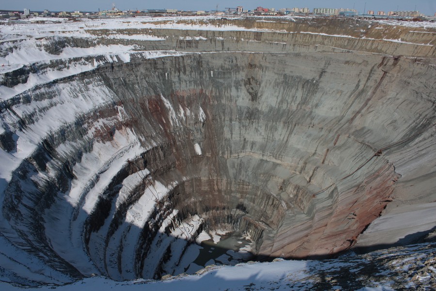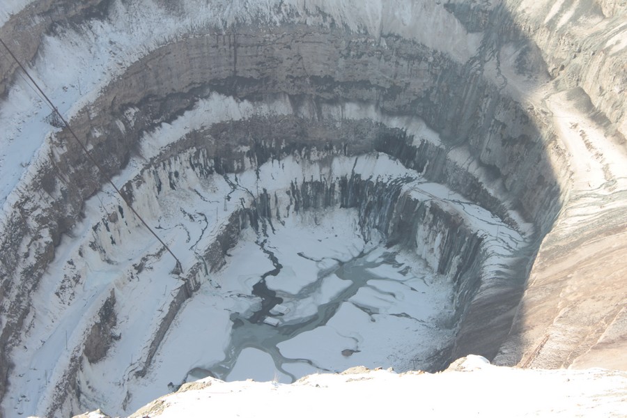:D засыпать её не будут. оставят так. карьер прекратили отрабатывать открытым способом из вскрытия водоносного горизонта, содержащего не воду а очень концентрированный рассол, сероводородный. одно время эту воду откачивали и сливали в специально созданный накопитель (постараюсь найти фотки и выложить) расположенный недалеко. А раньше внизу стоял огромный экскаватор и нагружал руду в Белазы (маленькие, 40-60 тонн), которые спускались-подимались по спиральной дороге, вдоль стены карьера. остатки этой дороги можно разглядеть на фотографиях. по словам месных белазистов, спуск занимал 40 минут, столько же подъем. По данным геологоразведки, алмазоносное кимберлитовое тело простирается ниже дна корьера еще на 500-600 метров, сейчас построен подземный рудник "Мир" для добычи кимберлитовой руды закрытым способом, по типу шахты, правда пока в работу его так и не запустили. а дно открытого карьера присыпали спец составом, для перекрытия водоносного горизонта, но все равно малость подтекает (это видно на фотках). также видно что на одном уступе карьера строится очередная насосная станция, видимо для откачки.